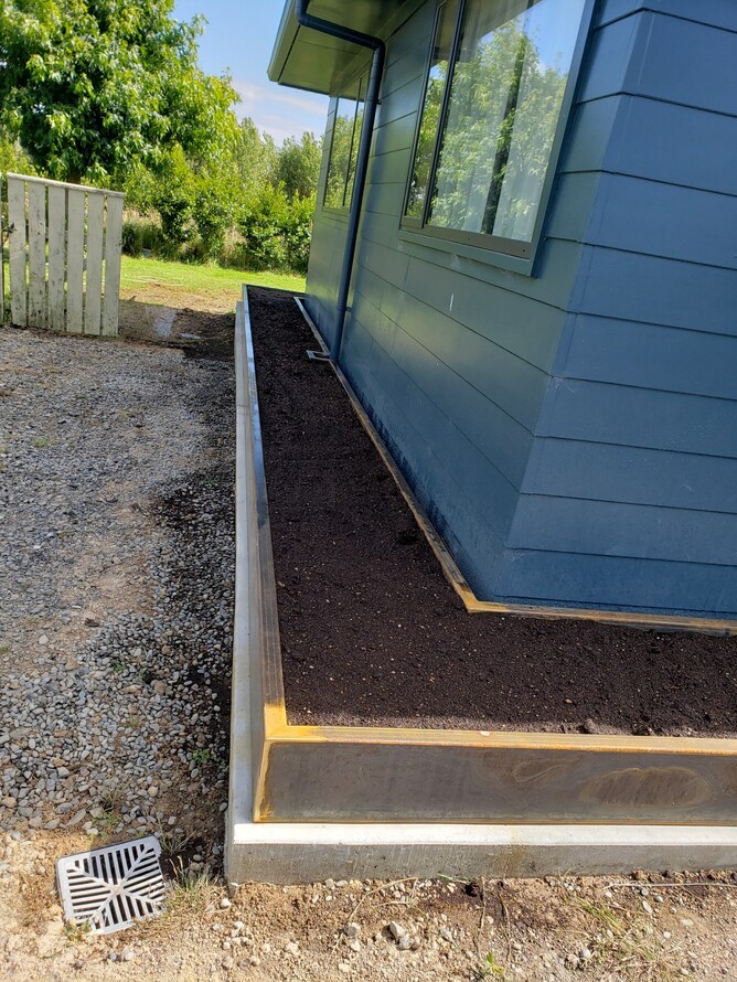 Large Corten planter-box gardens, wraps around house front. Gotta love the clean sleek straight edges and the rustic Corten look. Came up awesome and really tidied up this property. Will only look better with age as the Corten weathers to an even finish. Contact us for your own custom Corten look.