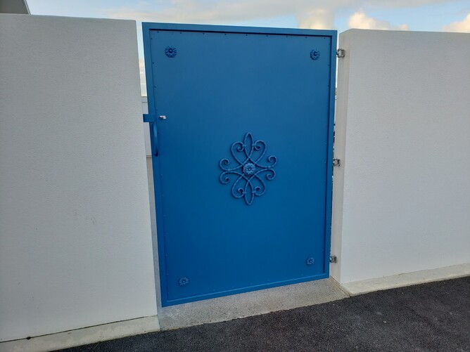 Custom built gates. Came up spectacular as a feature and adds a brilliant pop of colour. Contact us for your custom fences & gates.
