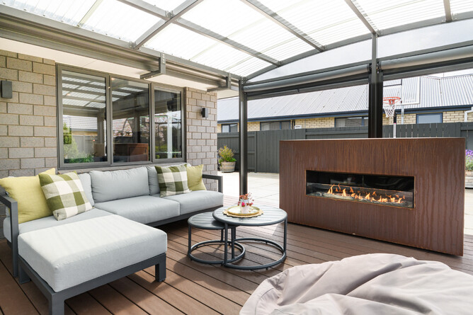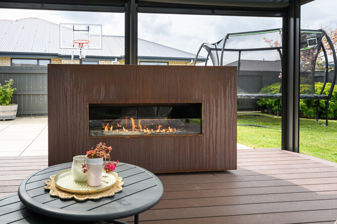This stunning mobile outdoor gas fireplace is the centerpiece of any outdoor living area.